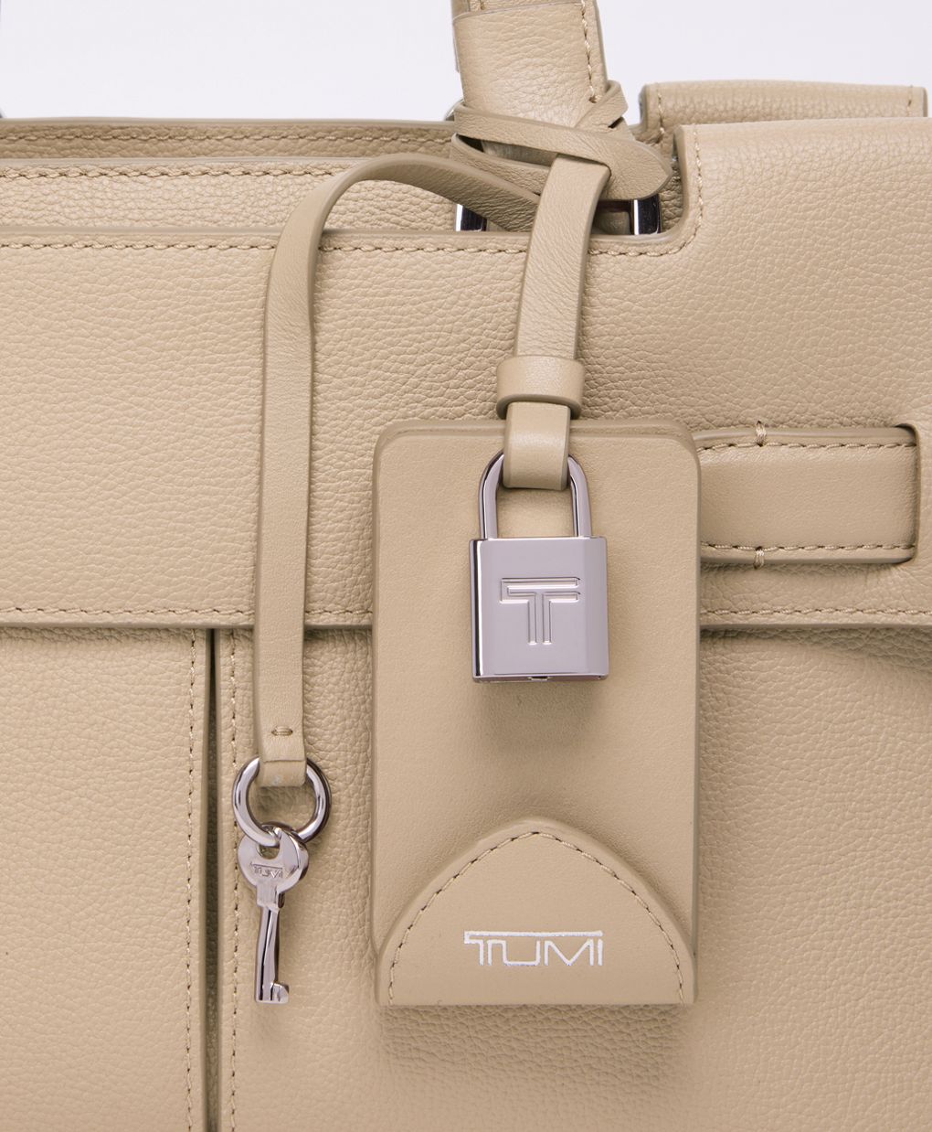 - Monogrammable detachable leather charm with functional TUMI "T" lock